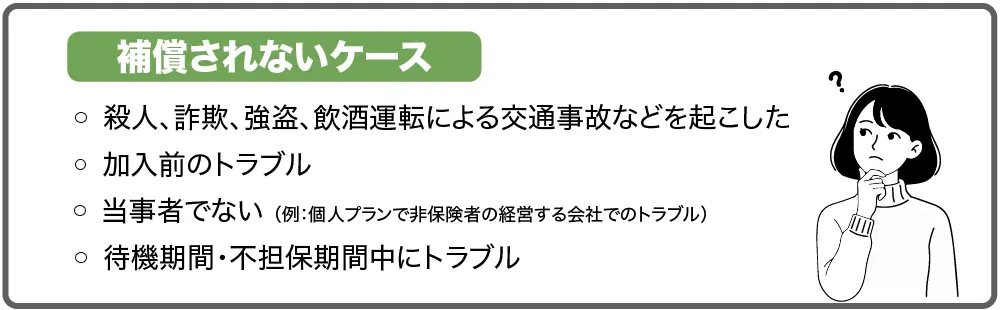 例えば「保険契約者が経営している会社で起きた法人トラブル」などはトラブルの当事者が会社(=法人)となり補償対象外になります。